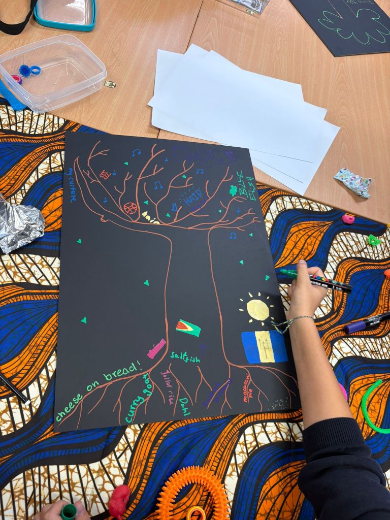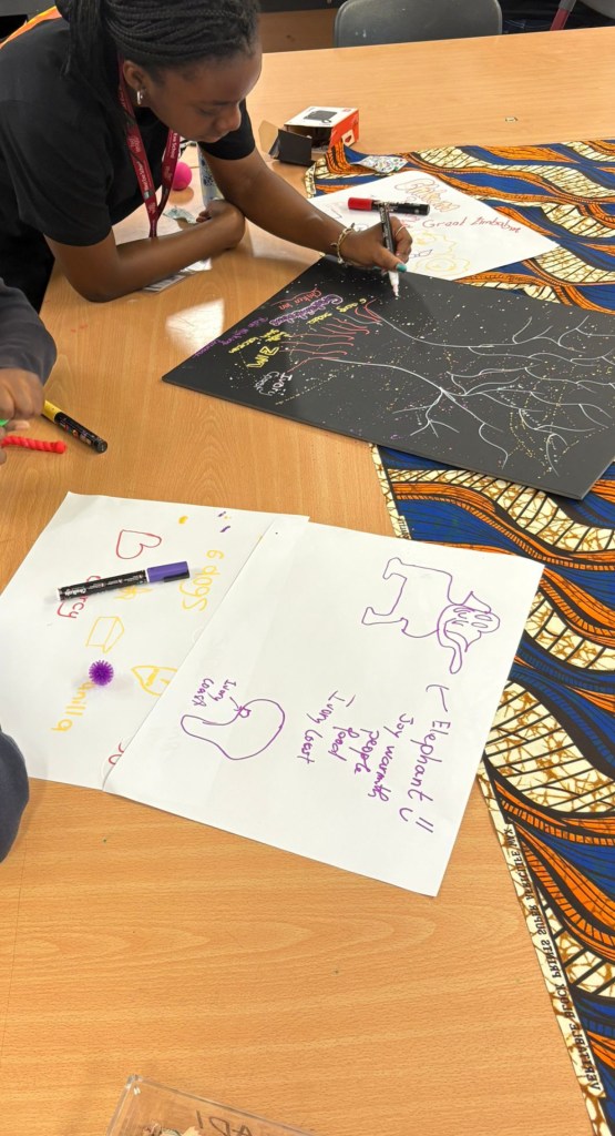 Once we settled into the classroom, the school’s art room, we set it all up. Each of us brought a tote bag to set up with, our B-HUGs reciprocal learning kit; within the bags we had speakers (on which we played afrobeats, amapiano and music by Black musicians), and as well as traditional African fabric, each different but equally as beautiful. For days we had been preparing to get ready for the session, each discussing our goals and boundaries, all wanting to strike the balance between guidance and mentorship with openness. I believe that, though we all said different things, we all agreed that the most important thing we wanted to do was give the young people something we all need – a safe space for youth to be Black in a time where there is much negativity around us.