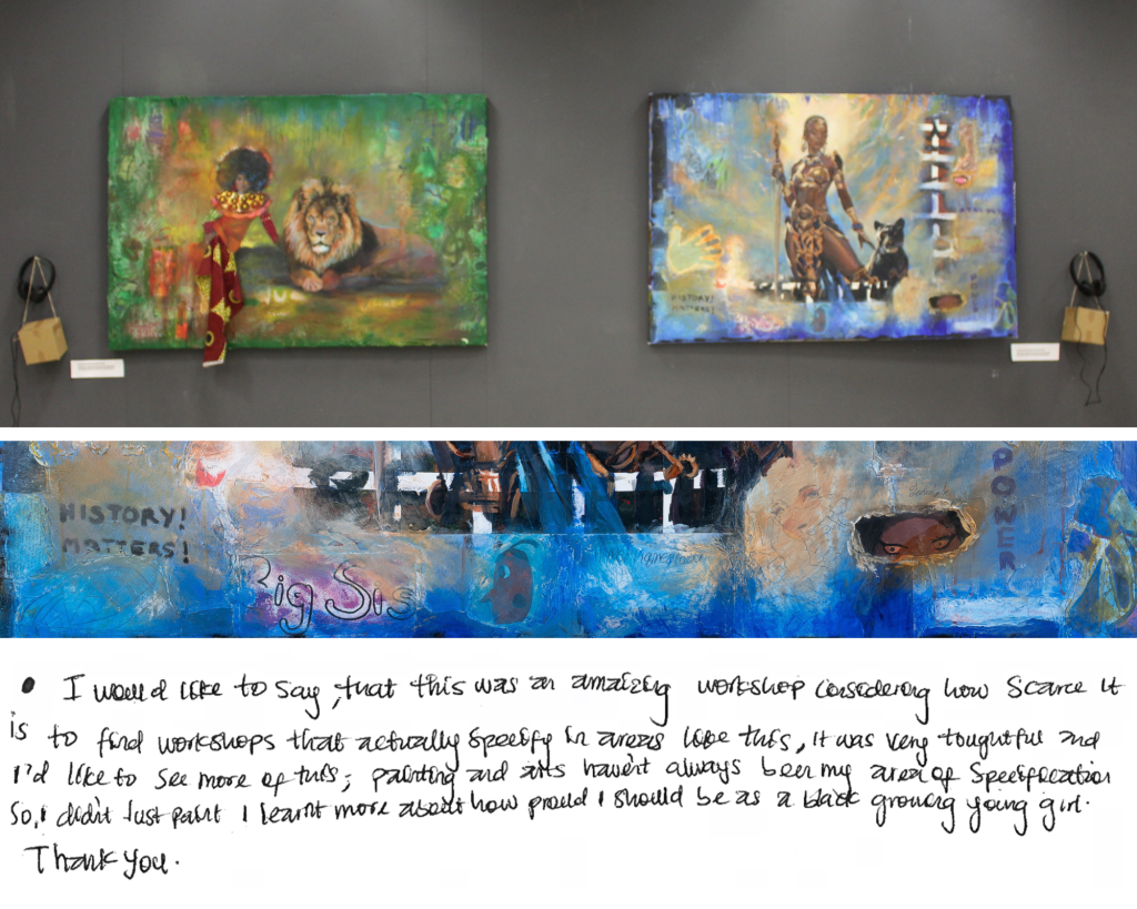 Creative workshops let us safely engage in critical social dialogue. Above, collage artworks on canvas produced in collaborations between ~50 secondary school students across two schools and artist Jedidah Chick and exhibited as part of the ESRC Festival of Social Science (Row 1, https://festivalofsocialscience.com/events/we-are-we-belong/). The collage nature of the pieces can be seen in the close-up in Row 2. Workshops ran over two 3-hour sessions at each school (4 sessions total) and participants at both schools were unanimous in their positive reflections, even those who started off unsure of whether they were interested in taking part, reiterated how impactful the workshop was for them (Row 3).